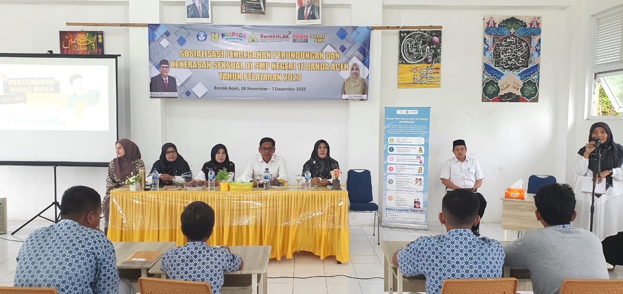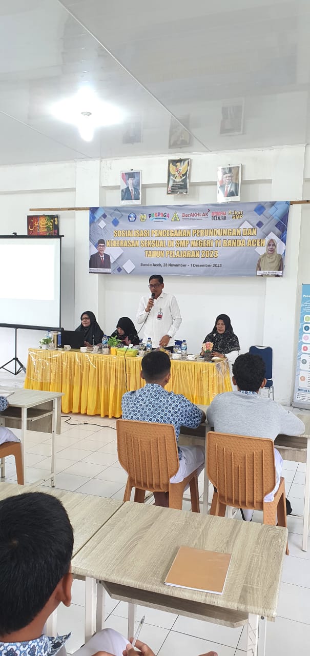 Banda Aceh, Kegiatan sosialisasi perundungan dan kekerasan seksual di SMP Negeri 11 Kota Banda Aceh dilaksanakan selama 4 hari berturut-turut mulai dari tanggal 28 November sampai dengan 1 Desember 2023. Kegiatan ini dibuka oleh KADISDIK Kota Banda Aceh Bapak Sulaiman Bakri, S.Pd. M.Pd. Pemateri kegiatan ini adalah TIM P3AP2KB (perlindungan perempuan, perlindungan anak, pengendalian penduduk dan keluarga berencana) Kota Banda Aceh Ibu Dina Aprilia Pulungan, M.Psi, Risda Zuraida, SE, Sufrina Kumala Ayu, S.Psi.M.Ed, dan Dr. Qurrata A'yuna,M.Pd. Adapun peserta kegiatan ini adalah seluruh siswa/i dari kelas VII, VIII, dan IX, dewan guru, komite sekolah, serta seluruh wali siswa/i tersebut. Diselenggarakannya kegiatan ini bertujuan untuk memberikan pemahaman tentang pentingnya pencegahan perundungan dan kekerasan seksual karena dapat terjadi dimana saja dan kapan saja. Diharapkan semua yang ikut dalam kegiatan ini dapat meningkatkan pengetahuan dan kesadaran terhadap pentingnya pencegahan perundungan dan kekerasan seksual, serta dapat mengetahui tindak lanjut yang dapat dilakukan apabila melihat atau menjadi korban perundungan dan kekerasan seksual baik di lingkungan keluarga, sekolah, maupun masyarakat.